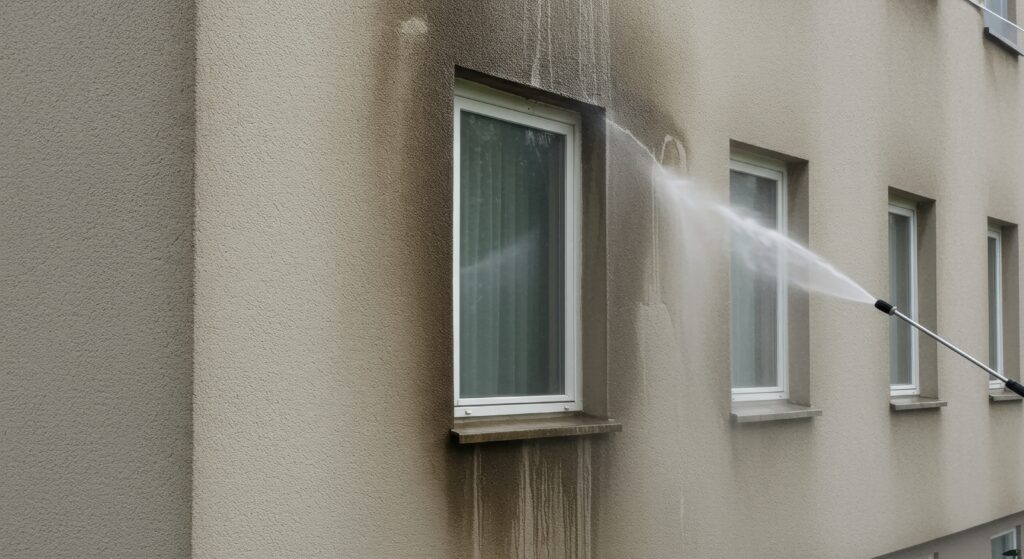 Une façade en bon état ne se limite pas à son apparence : elle doit aussi être entretenue et protégée contre l’humidité et les micro-organismes. C’est pourquoi nous commençons par un nettoyage complet de façade, afin d’éliminer salissures, dépôts verts et traces de pollution.